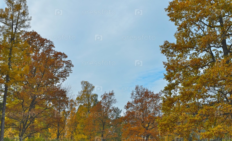 Вид на лес с деревьями, отображающими осенние цвета в светло-синем небе. Концептуальный дизайн фона
