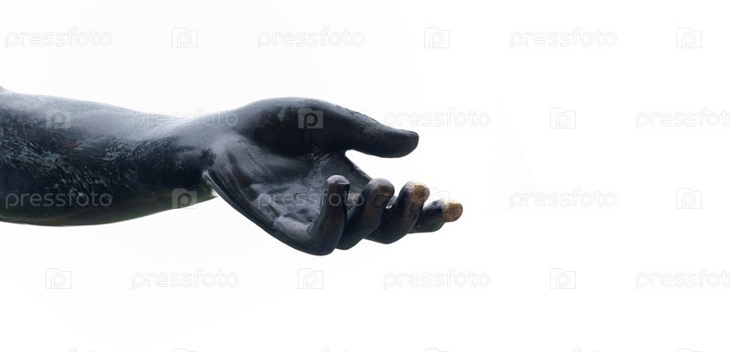Бронзовая рука античной статуи в жесте приглашения изолирована на белом фоне