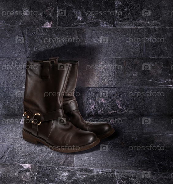 Старые кожаные сапоги изолированы на фоне черного камня