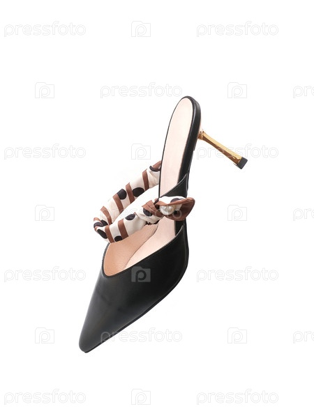 Элегантные мулы из черной кожи с золотыми высокими каблуками (Stiletto heel), выделенными на белом фоне