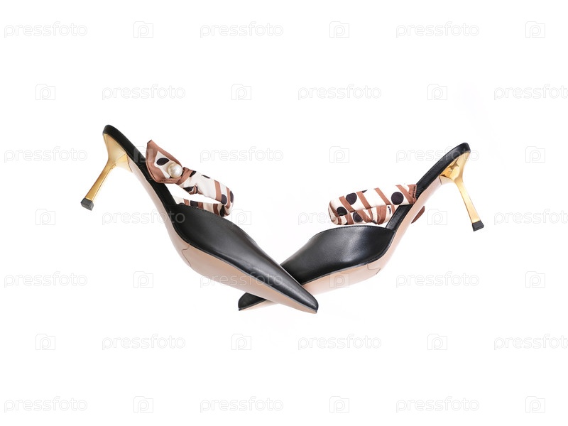 Элегантные мулы из черной кожи с золотыми высокими каблуками (Stiletto heel), выделенными на белом фоне