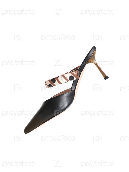 Элегантные мулы из черной кожи с золотыми высокими каблуками (Stiletto heel), выделенными на белом фоне