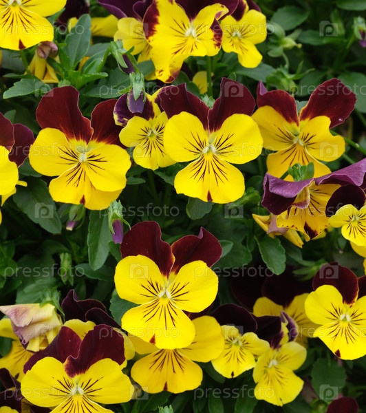 Виола с рогами. цветочное поле, плотные желтые и коричневые цвета для ботанических обоев и цветочных рисунков