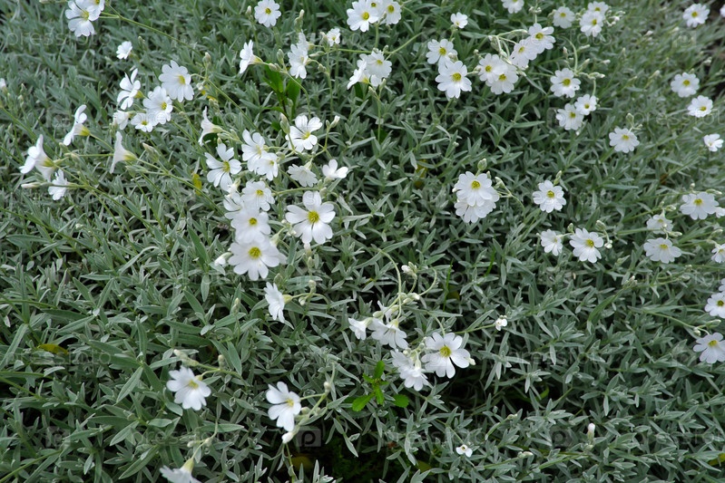 Ковер из цветов 'Снег летом' (Cerastium), пышная зеленая луга, усеянная крошечными белыми цветами, весенний крупный план (естественный фон)