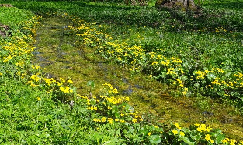 Лесной ручей Серена, мирная природа с желтыми полевыми цветами