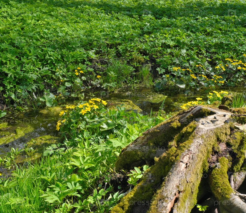 Сырой лесный ручей со старой коноплей и корнями, мирная природа с желтыми дикими цветами