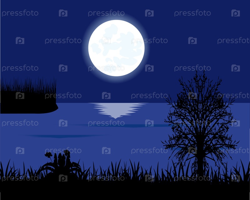 Лунная ночь и прибрежное озеро с травами и деревьями