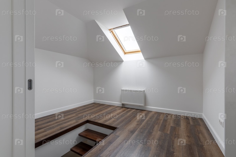 Современное мансардное пространство с белыми стенами, деревянным полом, открытой дверью, ведущей в спальню и открывающейся лестницей