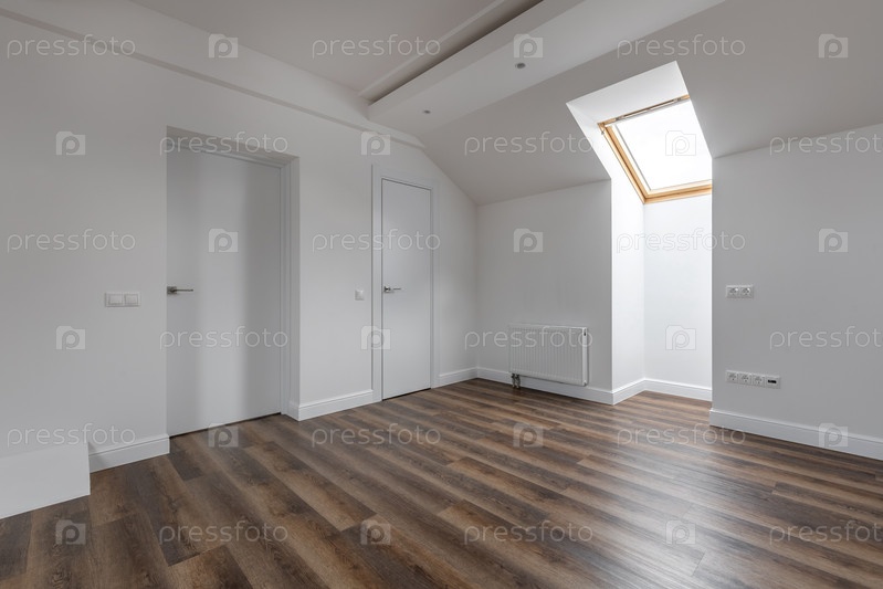 Современный чердак с белыми стенами, деревянным полом, люком и несколькими дверями создает просторный и минималистичный интерьер