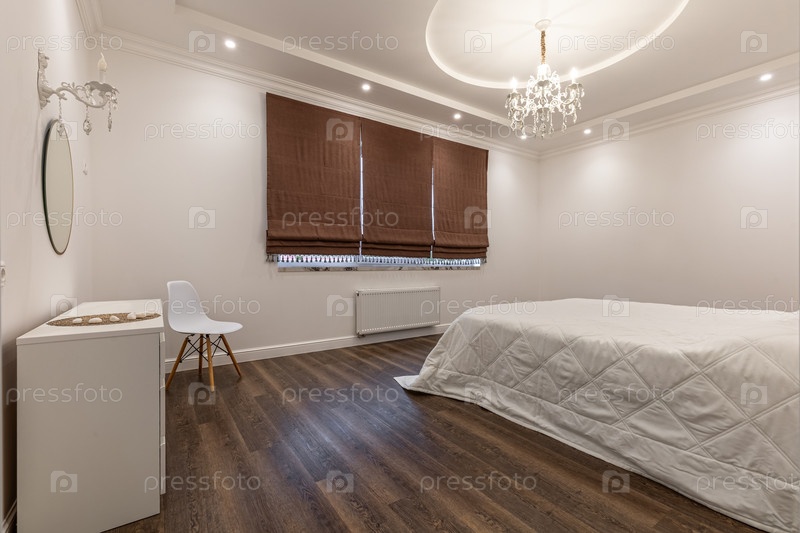 Стильная спальня с кристаллической люстрацией, пышной головкой, коричневыми римскими жалюзи и классическим декором, создавая теплую и уютную атмосферу