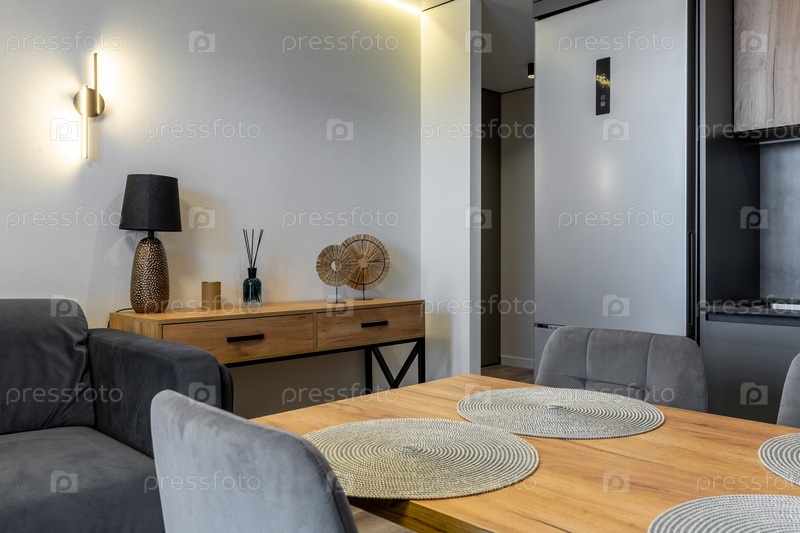 Уютная и современная жилая комната с деревянным столом, мягкими серыми стульями, стильной консолью, теплым освещением и декоративными акцентами