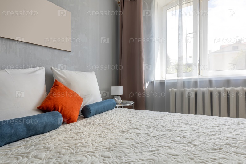 Яркая спальня с акцентными подушками и окном