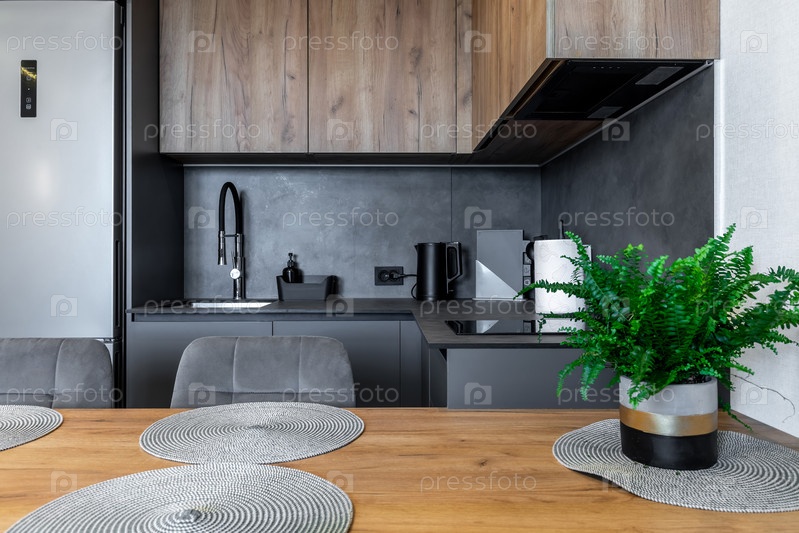 Современная кухня с матовыми шкафами и деревянными акцентами