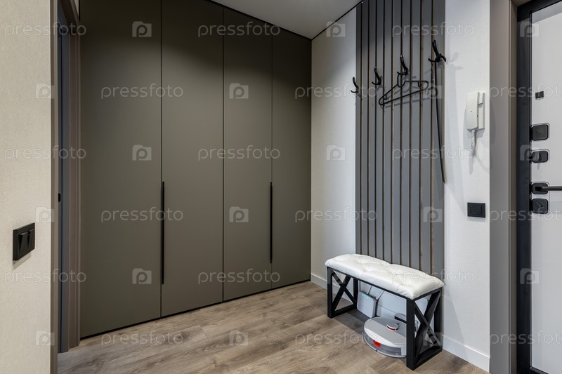 Современный вход с встроенным гардеробом и скамейкой