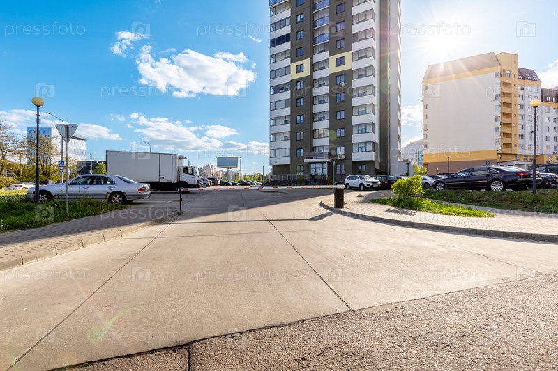 Современный вход в квартиру с барьерными воротами, асфальтированной подъездной дорогой, прилегающими парковочными местами, фасадом жилого здания, ландшафтным дизайном и чистым солнечным небом над головой