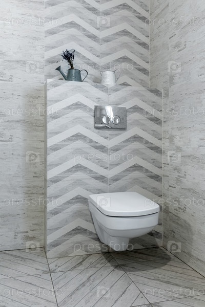 Современный стеновой туалет с геометрическими серыми и белыми плитками, хромными кнопками и декоративными металлическими кувшинами на полке