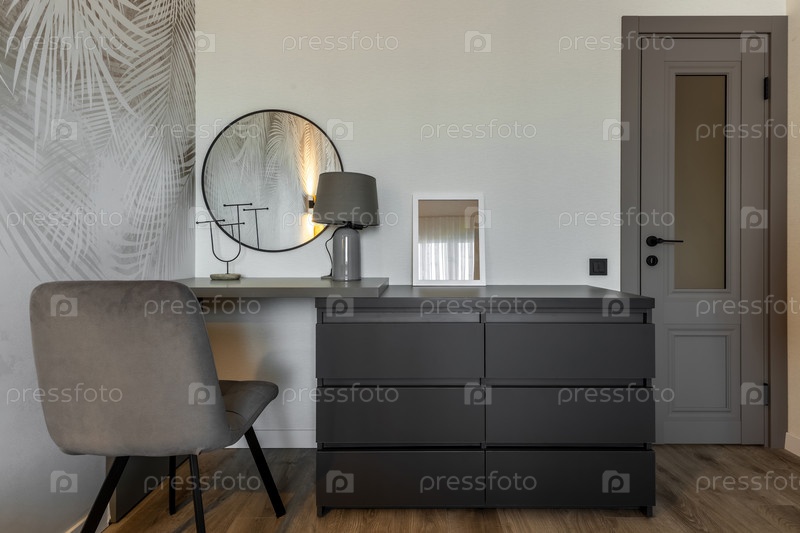 Современная зона тщеславия с изящным столом, мягким стулом, круглым зеркалом, окружающим светодиодным освещением и декоративными аксессуарами на нейтральной стене