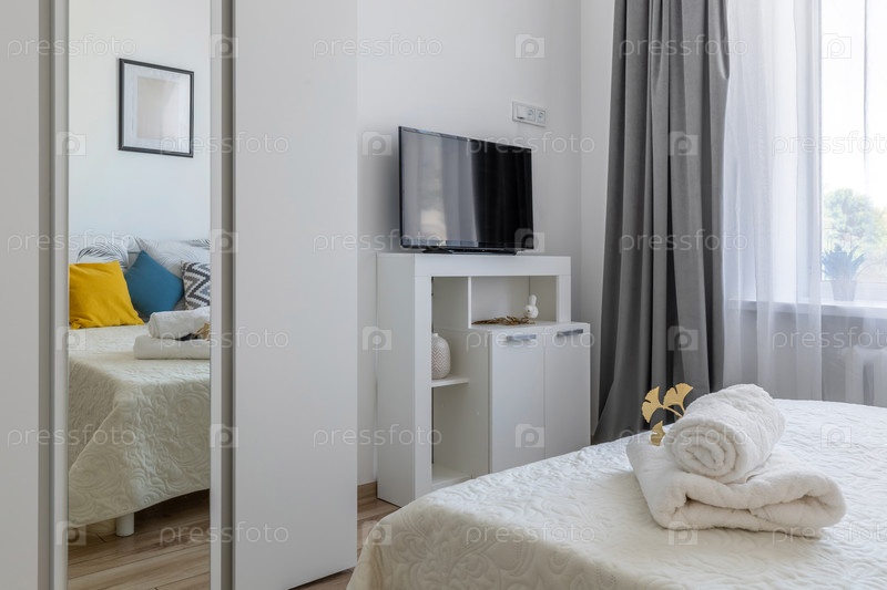 Яркая современная спальня с телевизором, зеркалом, сложенными белыми полотенцами и уютным минималистическим декором на дне