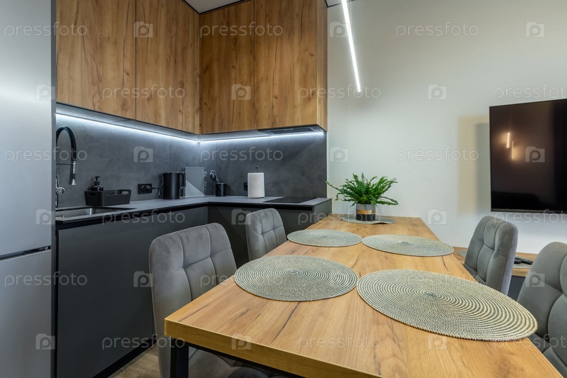Современный кухонный интерьер с деревянным обеденным столом