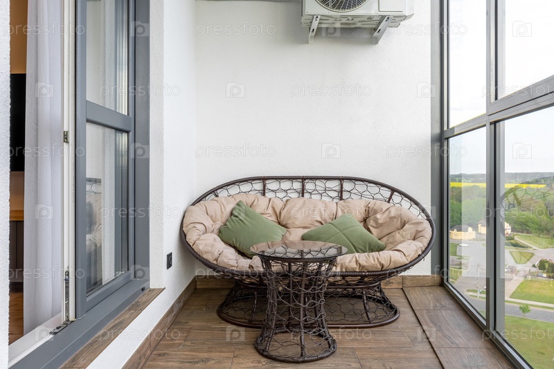 Уютный балконный зал с ратанной мебелью и живописным видом