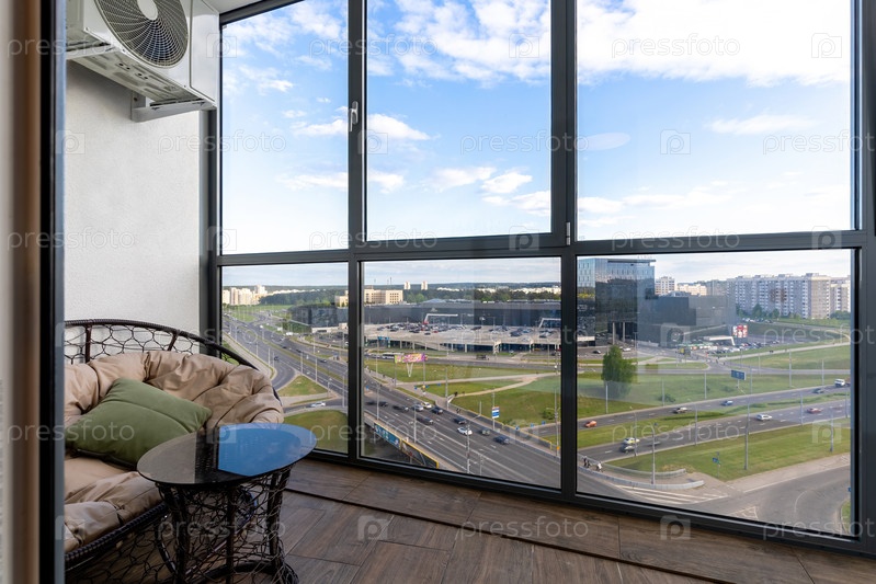 Панорамный вид на город с уютного стеклянного балкона