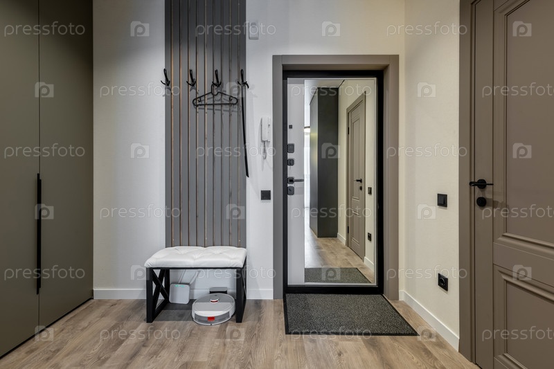 Стильный вход с скамейкой и крючками