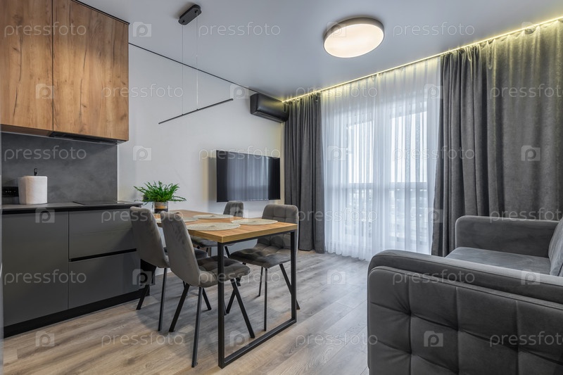 Современное открытое пространство с серым диваном, деревянный обеденный стол с мягкими стульями, изящные кухонные шкафы и окно от пола до потолка с прозрачными и затемненными шторами