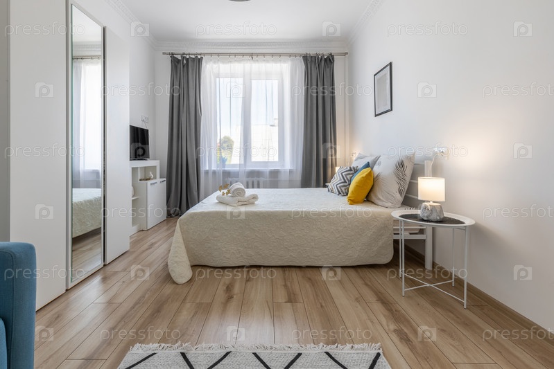 Просторный минималистский интерьер спальни с украшенной кроватью, прикроватными лампами, телевизором, зеркалом, деревянным полом и мягким дневным светом из окна