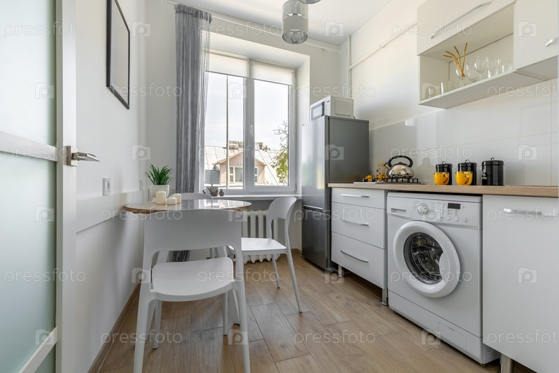 Яркий современный кухонный интерьер с белыми шкафами, деревянной столешницей, обеденным столом, окном, стиральной машиной и стильным декором