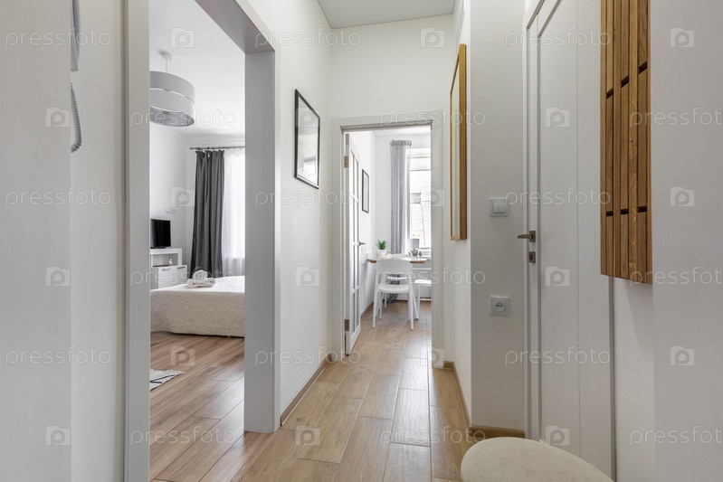 Современный узкий коридор в светлой квартире с деревянным полом, ведущий к уютной спальне и кухне