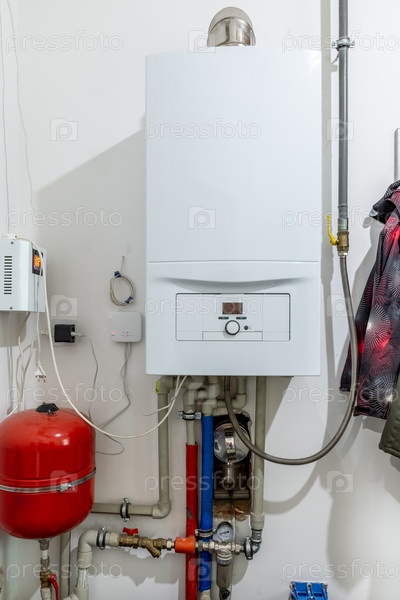 Современный стеновой газовый котел с трубопроводами и системой управления в гостиной