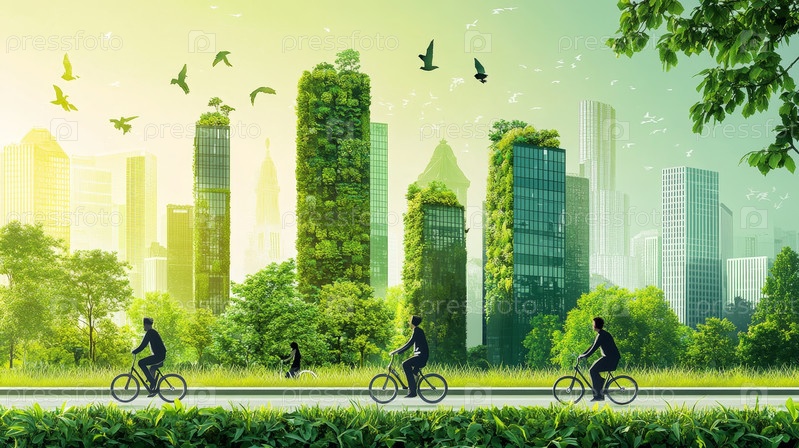Гармония будущего города: велосипедисты среди зеленой архитектуры в современном городе