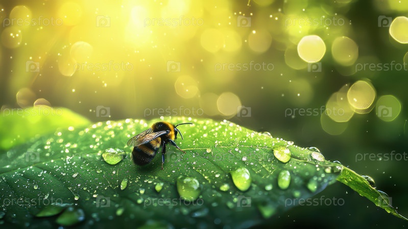 Пчела покоится на росовом листе в солнечном свете