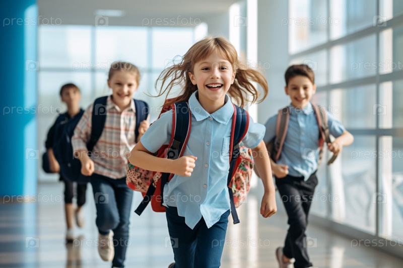 Веселые студенты бегут по коридору, взволнованы и энергичны