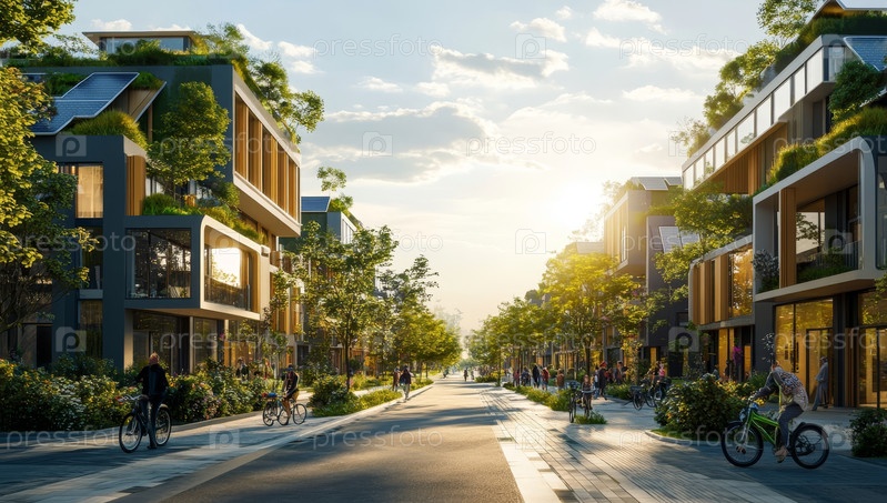 Эта яркая иллюстрация показывает современный городской пейзаж с солнечными батареями, пышными деревьями и велосипедом, символизирующим экологически чистую городскую жизнь