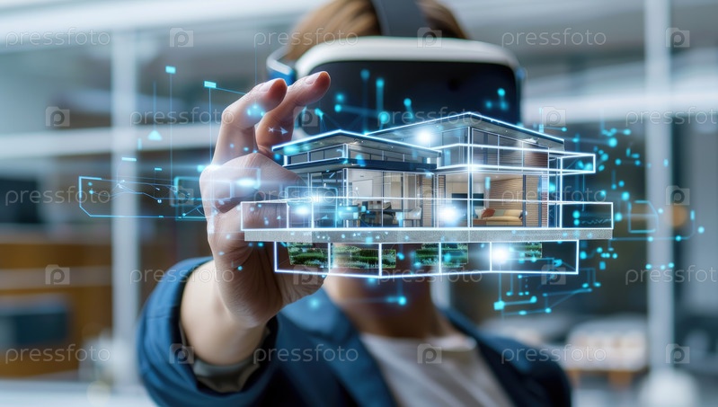 Человек использует технологии виртуальной реальности для визуализации подробной голографической модели современного дома, иллюстрирующей передовое архитектурное планирование