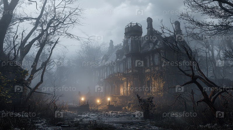 Очаровательный особняк, окруженный туманом и мертвыми деревьями