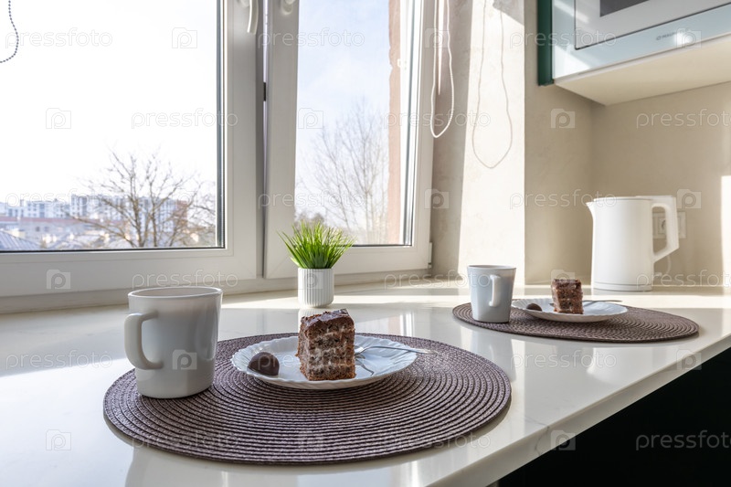 Уютная кухня с ярким оконным баром на завтрак, две чашки кофе, кусочки торта, белый чайник и зеленые шкафы в современном минималистическом дизайне