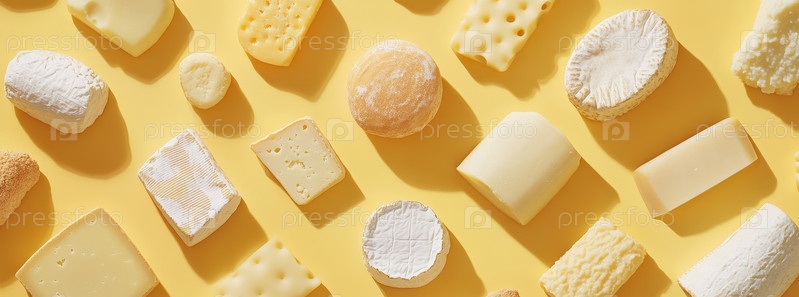 Яркий ассортимент сыров показывает различные текстуры и формы на ярко-желтом фоне