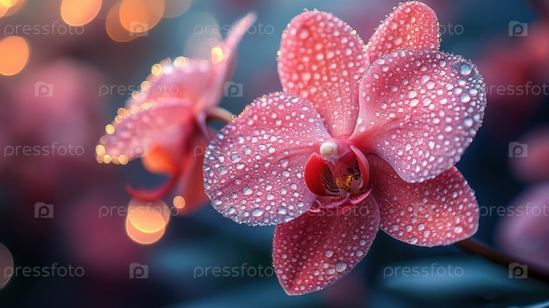 Близкий план розовых цветов орхидей, покрытых капельками воды и освещенных мягким боке
