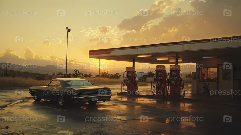Классический автомобиль на заправочной станции в Золотой час