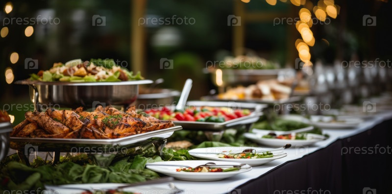 Мясо и овощи, еда на столе-буфете в отеле, группа людей на пищевом буфете внутри дома в ресторане с жареным мясом