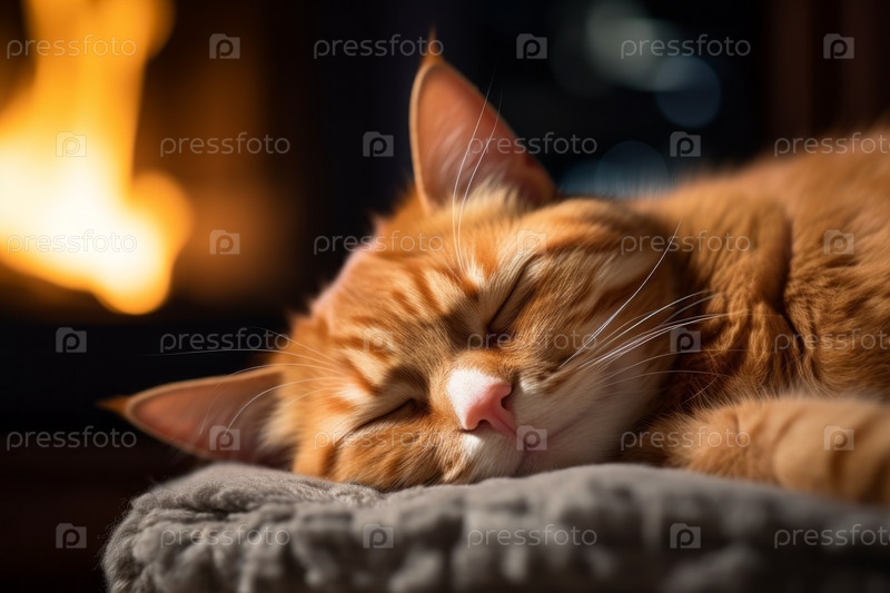 Рядом с кошкой, расположенной на уютном ковре возле трескающегося камина