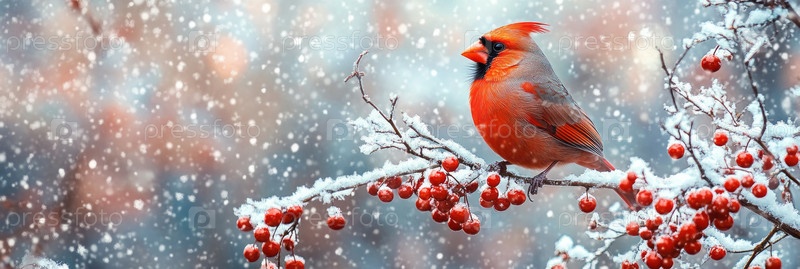 Ярко-красный кардинал сидел на снежной ветке зимой