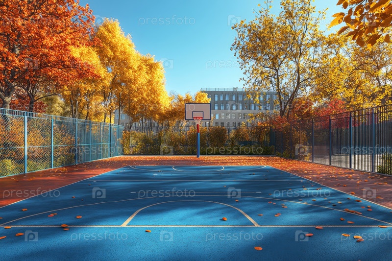 Спокойный баскетбольный корт в окружении ярких осенних деревьев приглашает игроков насладиться солнечным днем на свежем воздухе