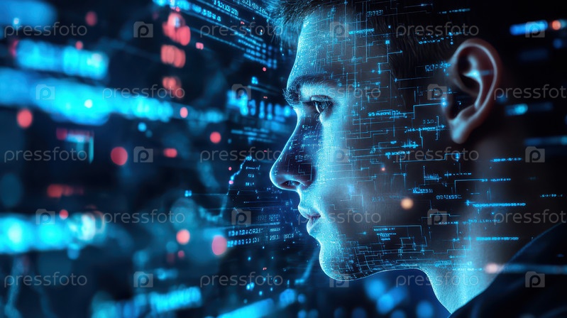 Двойная экспозиция лица человека смешивается с потоками цифровых данных и светящимися синими сетями, символизирующими технологии, связь и цифровой интеллект