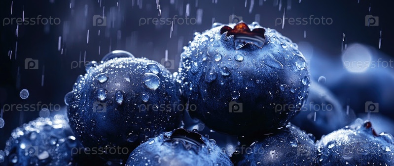Сочные черники, отдыхающие на зеленых листьях с капельками росы, искрящимися на их поверхности