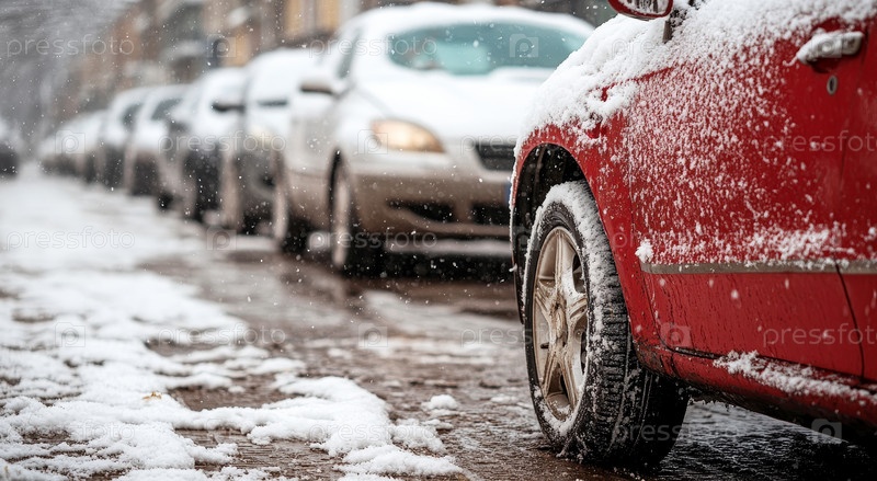 Снег окутывает живописный город, превращая улицу в зимнюю страну чудес, где автомобили и здания демонстрируют красоту сезона