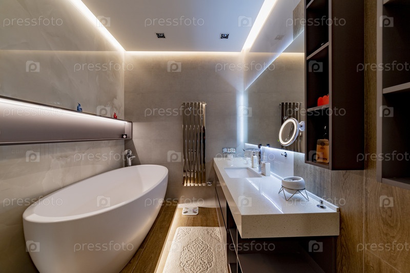 Современное многоэтажное жилое здание.Москва, ванная комната с подсветкой