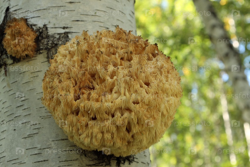 Желтый еж (лат. Hericium erinaceus) растет на стволе березы